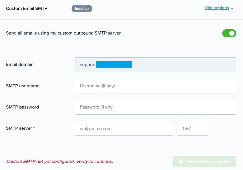 - Then, click on Advanced Configuration and expand the options under "Custom Email Domain." Enter a custom domain, such as